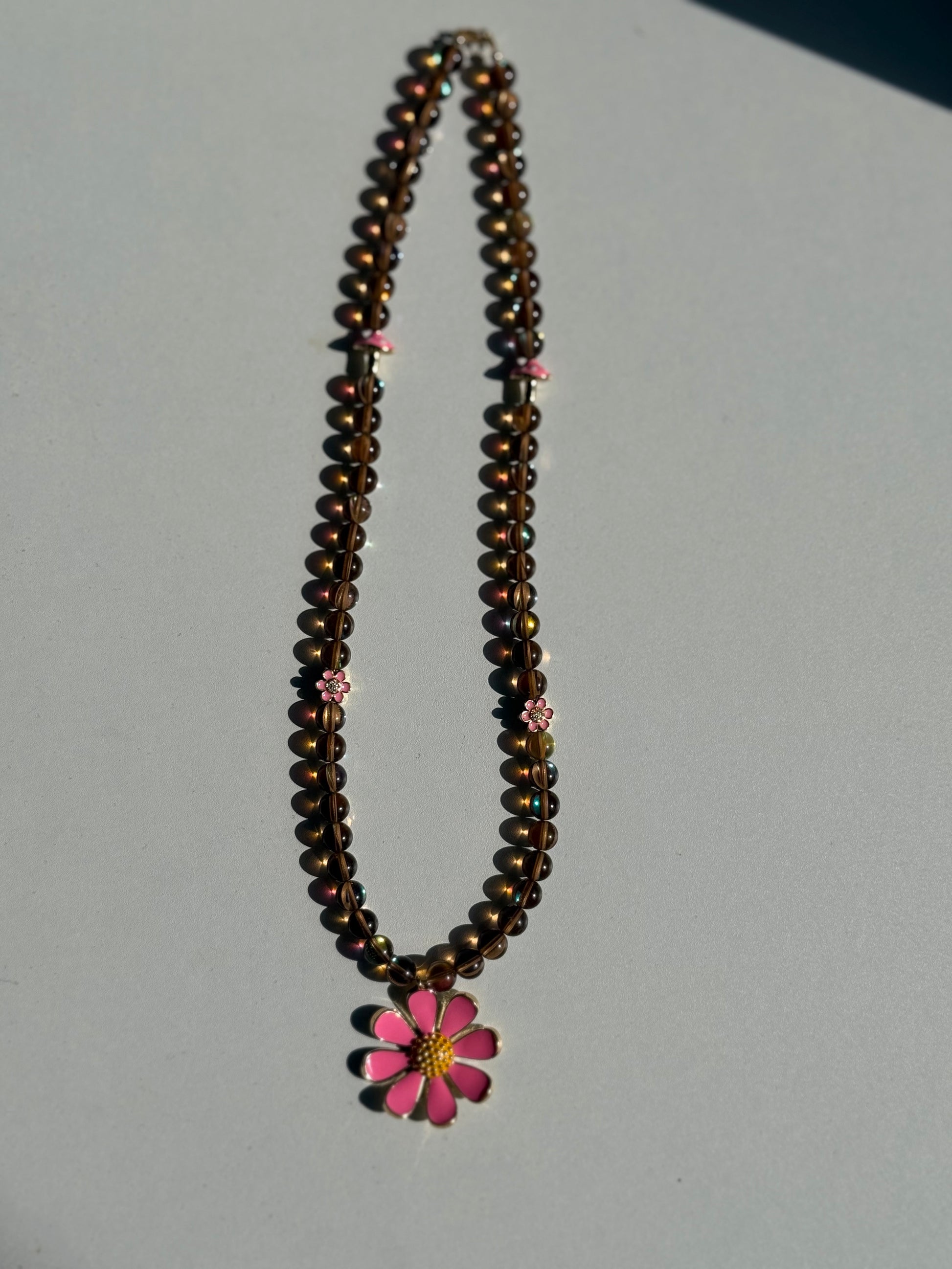 This distinctive 10 mm brown mermaid beaded 21 inches necklace combines artisanal craftsmanship with playful elegance. Adorned with delicate enamel mushrooms, charming pink daisies, and a striking oversized pink daisy centerpiece, each piece celebrates individuality and creative expression. The gold-plated clasp adds a refined finishing touch to this wearable art. Perfect for those who appreciate jewelry that tells a story and refuses to blend in.