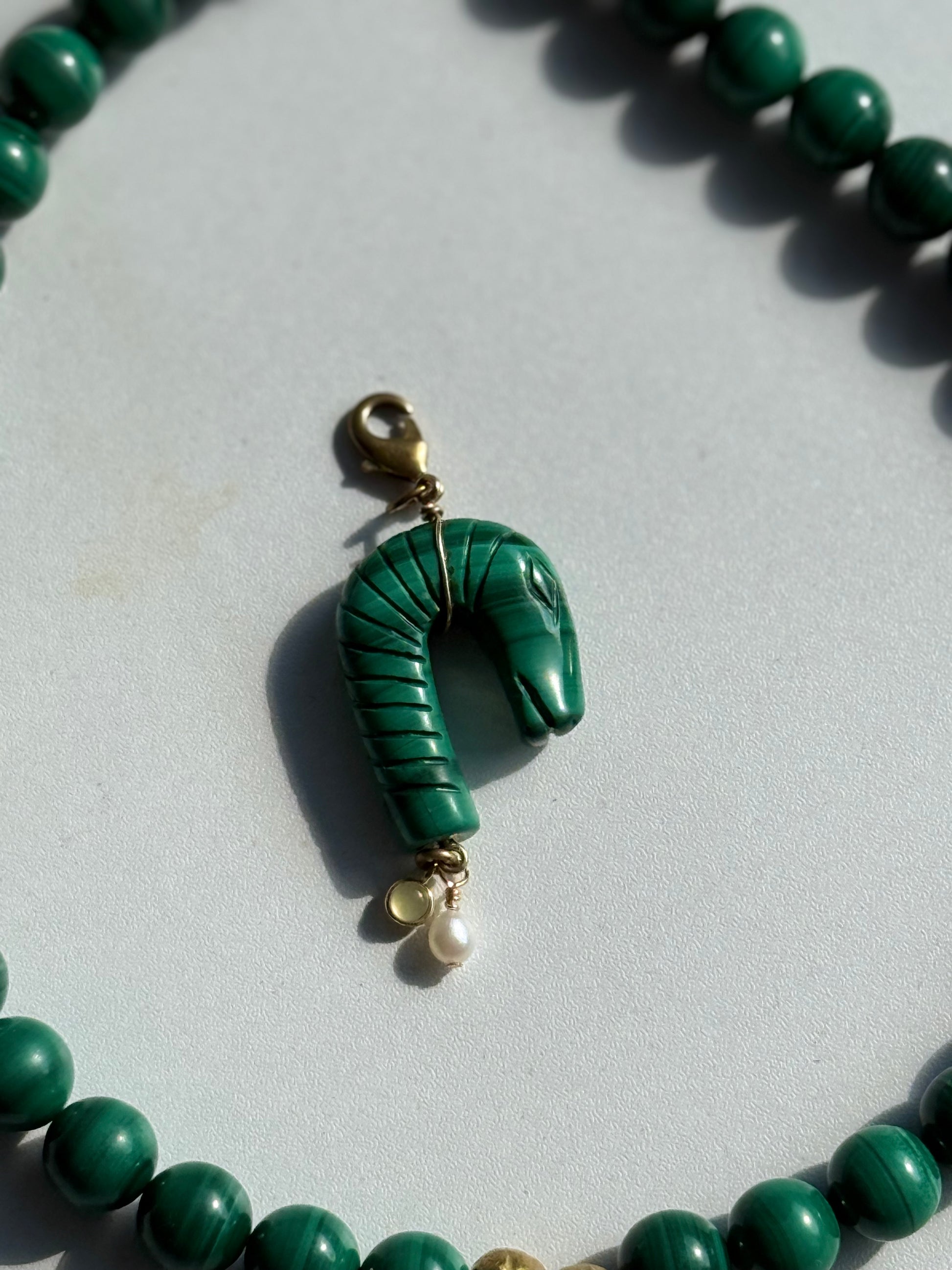 Crafted from a treasured vintage market discovery, this unique necklace marries timeless elegance with conscious design. The 16-inch strand features carefully curated 10mm beads in malachite and brass, anchored by a removable carved malachite horse pendant of striking refinement. One aventurine and one pearl charms cascade gracefully below, their gentle movement adding sophistication and visual depth. Entirely handmade, this piece transforms vintage materials into a contemporary statement—a testament to thoughtful curation and artisanal mastery. Perfect for those who recognize that true luxury lies in uniqueness, sustainability, and the quiet confidence of owning something genuinely irreplaceable.