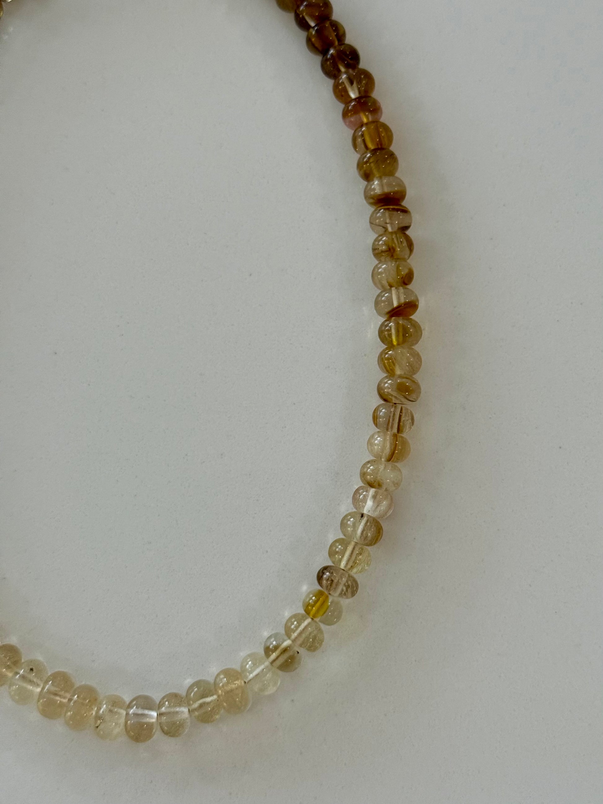 This elegant 15 inch choker features a stunning gradient of 6 mm quartz rondelle beads, transitioning seamlessly from rich smokey tones to pristine clarity. A refined piece that captures light beautifully, blending natural sophistication with understated elegance for any occasion.